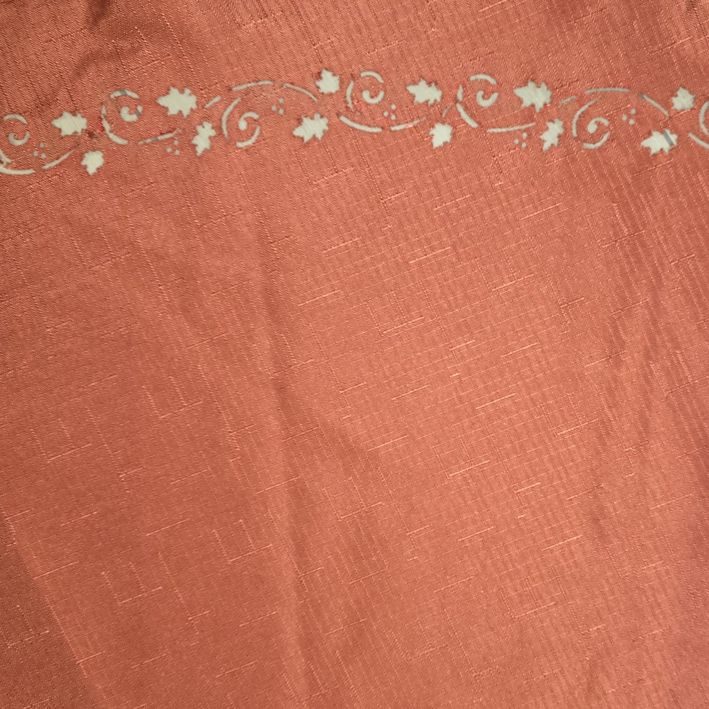 This skirt is very light weight. The perforated trim is designed to look like fall leaves and is about 1.5" from the hem. This tablecloth was found without a tag. We estimate it to be a polyester cotton blend.